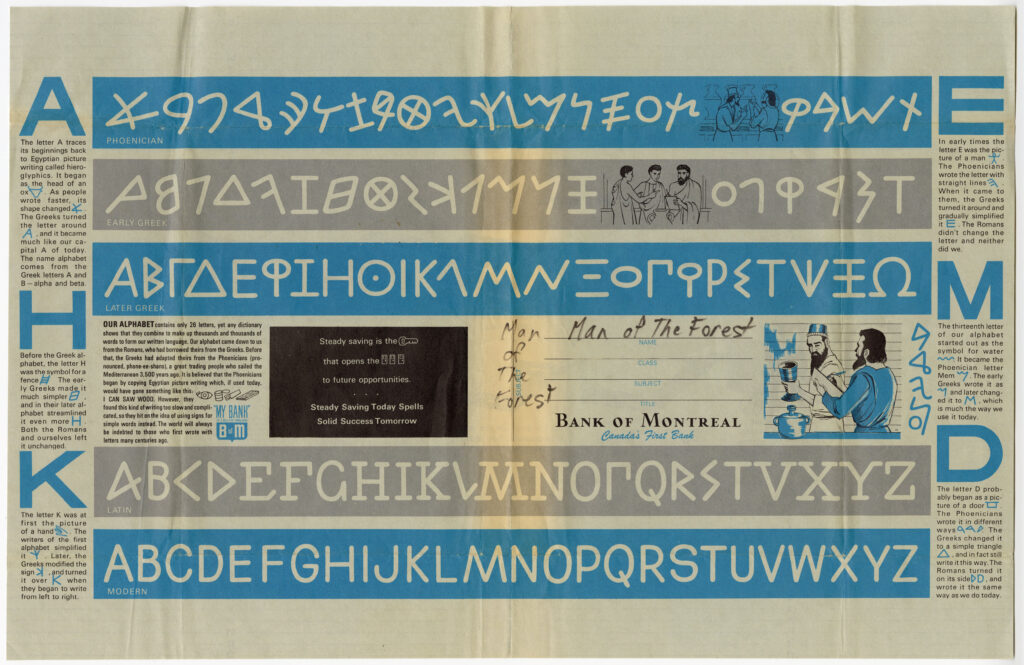 Later iterations of the book covers were more elaborate, providing a chronological overview of the history of the modern English alphabet. The book covers’ borders traced the origins and evolutions of individual letters in the English alphabet from Egyptian hieroglyphics and the Phoenician alphabet to the Greek and Latin alphabets. The letter K, for example, is described as originating from the Egyptian hieroglyphic of a hand. These book covers were innovative and educational – just another way that BMO helped customers make real financial progress. One for the books!