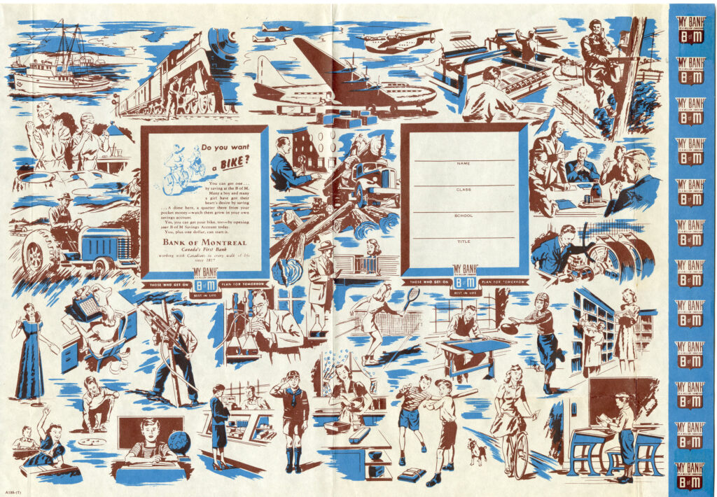 BMO has been making learning about finances fun for children since the mid-20th century. In the Corporate Archives, we have advertisements from this period that were designed to be folded into a book cover to protect schoolbooks. They were created in an effort to encourage schoolchildren to establish good financial habits. The covers even had a convenient space on the front for students to write their name, class, school, and book title.