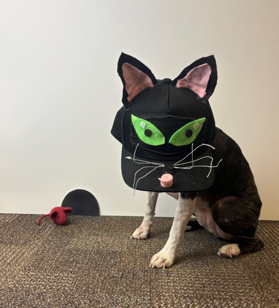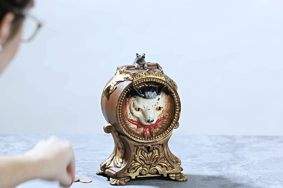 En cherchant des artéfacts félins dans les étagères, j’ai découvert cette reproduction en fonte d’une tirelire mécanique fabriquée par J. & E. Stevens en 1891. Ce formidable objet constitue une horloge de cheminée décorée d’un visage de chat. Au-dessus de l’horloge se trouve une souris devant la fente où l’on insère les pièces de monnaie. Lorsque le levier à la base de la tirelire est poussé vers le bas, la souris bascule et fait entrer la pièce de monnaie dans la tirelire. La souris est ainsi remplacée par un chat acrobatique en costume de cirque qui fait l’équilibriste et tient entre ses pieds une souris enroulée autour d’une balle. Cette miaou-gnifique tirelire inspirée d’un chat était un moyen amusant d’encourager les jeunes enfants à épargner afin qu’ils puissent améliorer leurs finances.